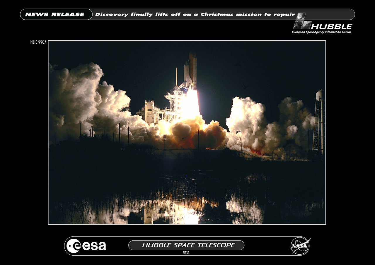 The Space Shuttle Discovery rises into the clear night sky to begin the 96th mission in the STS program.