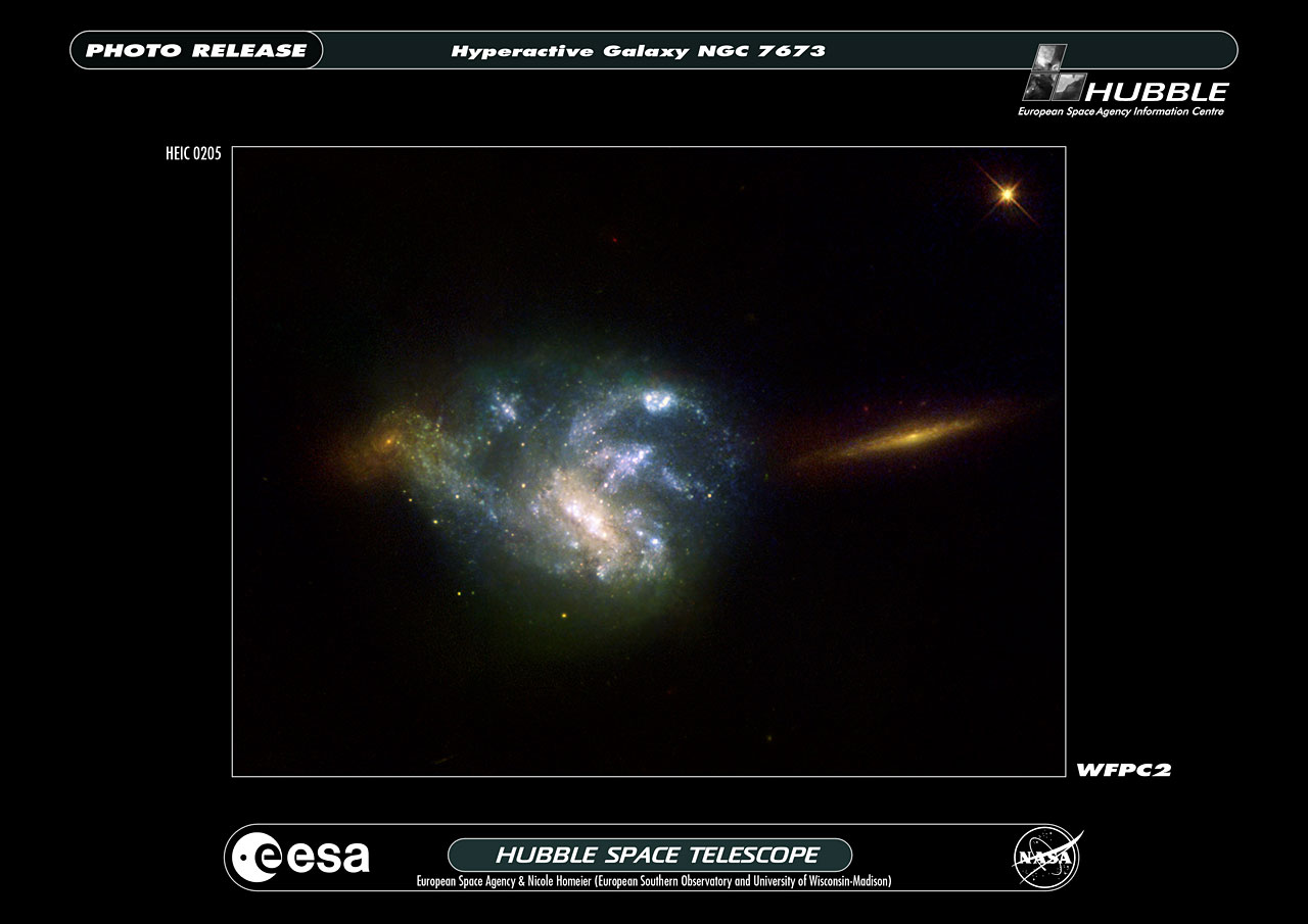 The galaxy NGC 7673 is located in the constellation of Pegasus at an approximate distance of 150 million light-years. This picture is composed of three images obtained with Hubble's Wide Field Planetary Camera 2 on 15 October 1996 and 11 October 1997. The three images were taken through a red filter (800 seconds), a green filter (1200 seconds) and an ultraviolet filter (2300 seconds) - shown in blue. Telltale patches of blue light are signs of the formation of millions of new stars in the tangled spiral galaxy NGC 7673. Each of the bluish areas in this image consists of immense star clusters containing thousands of young stars. These clusters lie on the spiral arms of NGC 7673 and so emphasise its somewhat ragged look. this image, taken form Earth orbit by the ESA/NASA/ESA Hubble Space Telescope in 1996 and 1997, also shows two other galaxies seen in the background of the image, to the left and right of NGC 7673. these galaxies are further away and so appear redder, due to their higher redshift, an effect caused by the expansion of the Universe. The youngest blue stars in NGC 7673 are blazing with intense ultraviolet radiation. Each star cluster radiates 100 times more ultraviolet light than the famous Tarantula Nebula (30 Doradus), the largest star-forming region known in the local group of galaxies.