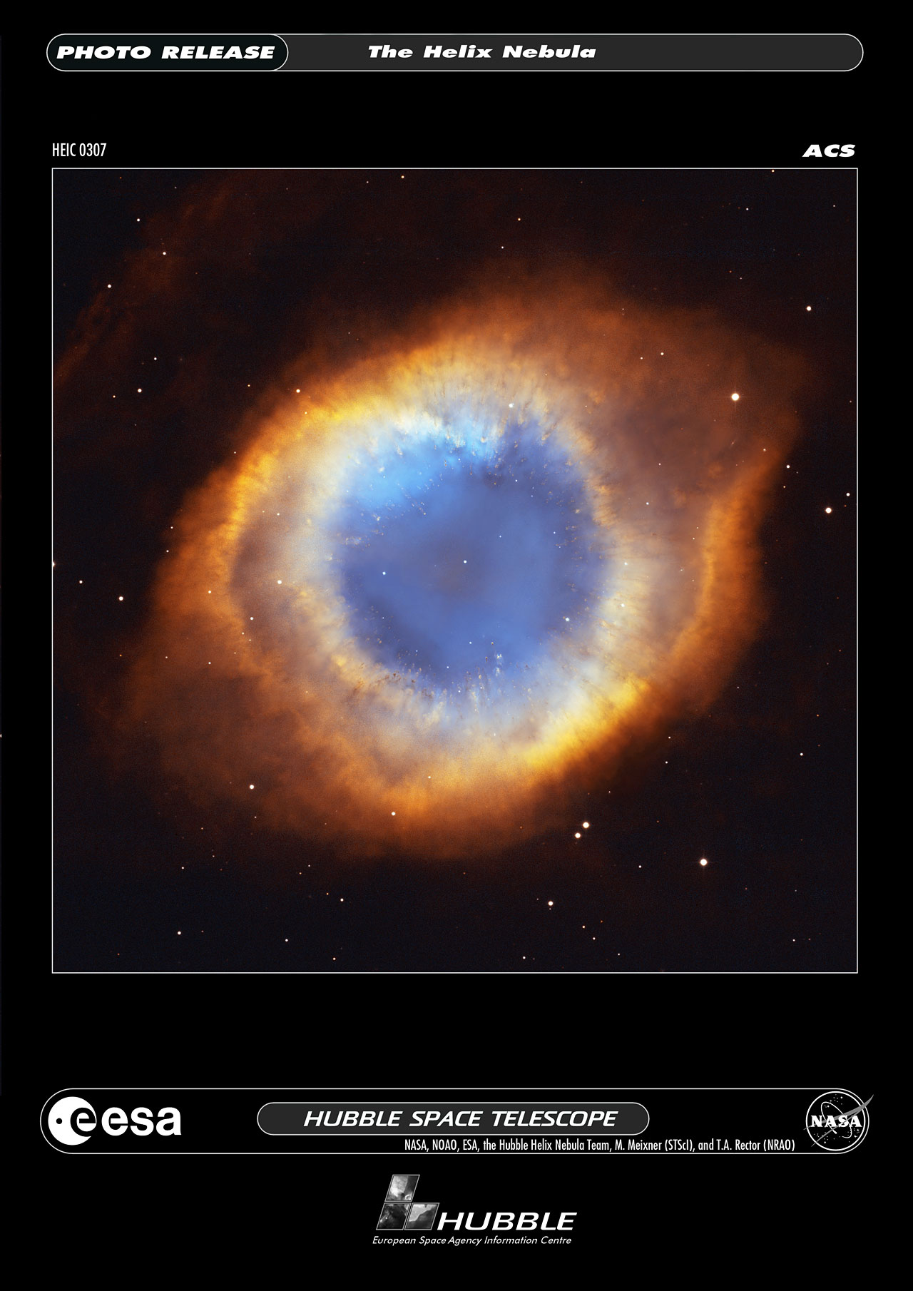 The composite picture is a seamless blend of ultra-sharp NASA/ESA Hubble Space Telescope HST) images combined with the wide view of the Mosaic Camera on the National Science Foundation's 0.9-meter telescope at Kitt Peak National Observatory, part of the National Optical Astronomy Observatory, near Tucson, Ariz. Astronomers at the Space Telescope Science Institute assembled these images into a mosaic. The mosaic was then blended with a wider photograph taken by the Mosaic Camera. The image shows a fine web of filamentary "bicycle-spoke" features embedded in the colorful red and blue gas ring, which is one of the nearest planetary nebulae to Earth.