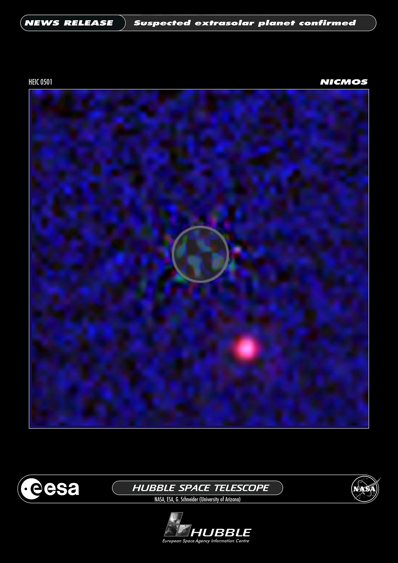 This is an artificial-colour Hubble Near Infrared Camera and Multi-Object Spectrometer (NICMOS) infrared-light view of the brown dwarf star 2MASSWJ 1207334-393254 (aka 2M1207) and giant planet companion candidate. The possible companion, estimated to be about five times the mass of Jupiter, is the magenta coloured spot at lower right. The brown dwarf's location is within the circle at image centre. The glare of the dwarf, which is 700 times brighter than the planet candidate (as seen at Hubble's near-infrared sensitivity) has been greatly reduced through image processing of NICMOS pictures taken at different Hubble orientations.