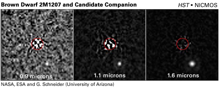 These are Hubble Near Infrared Camera and Multi-Object Spectrometer (NICMOS) Camera 1 images of 2M1207's giant planetary companion candidate at three increasingly longer near-infrared wavelengths [left to right: 0.9, 1.1, and 1.6 microns]. The light from 2M1207 itself has been greatly reduced by subtracting a second image of the star taken with Hubble rolled to a different orientation in the sky. Imperfections in the "differential roll" subtraction technique give rise to optical artifacts at the location of 2M1207, which is centred in the red circle of 0.2 arc-second radius. The giant planetary companion candidate is the white disk located outside and to the lower right of the red circle. 2M1207, a young brown dwarf of spectral type M8.5, is itself quite red - 11 times fainter at 0.9 microns than it is at 1.6 microns. The giant planetary companion candidate at 0.9 microns is significantly redder in comparison, 44 times fainter at 0.9 microns than it is at 1.6 microns where, at that shorter wavelength, it is also 720 times fainter than 2M1207.