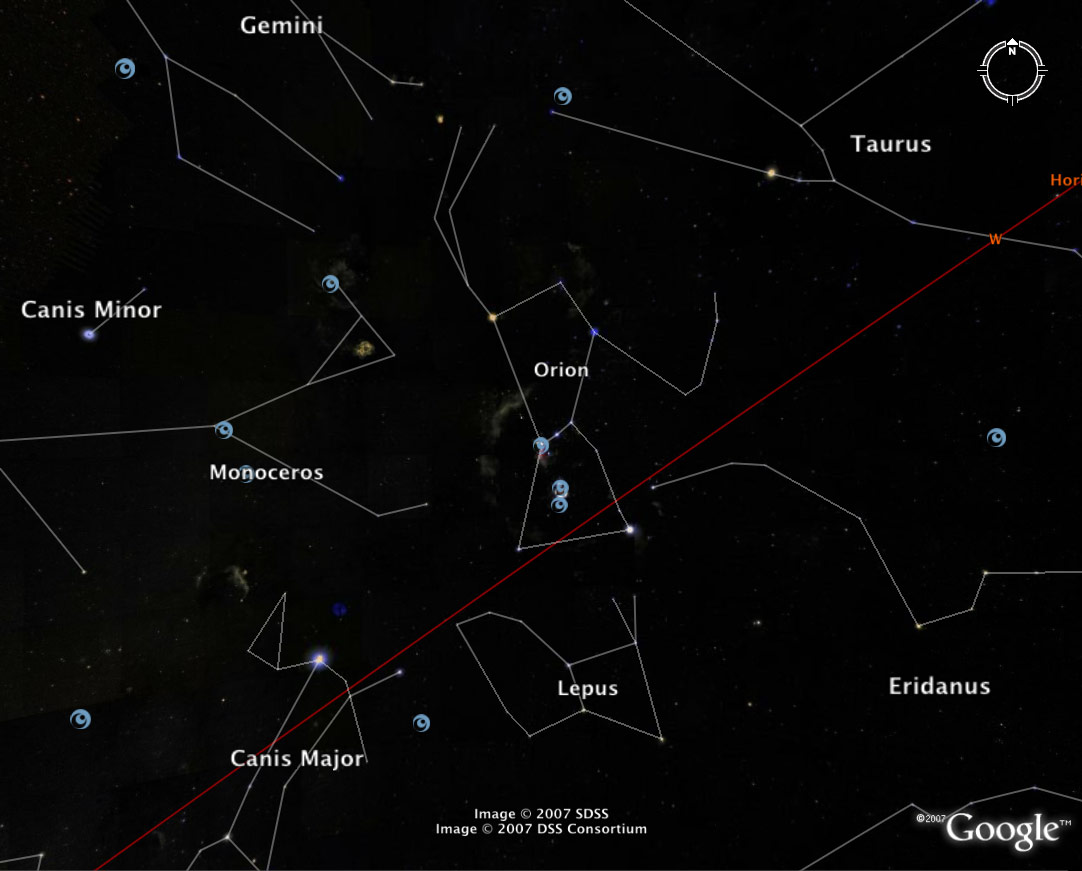 Screen snap from the Sky in Google Earth depicting boundaries around major constellations.