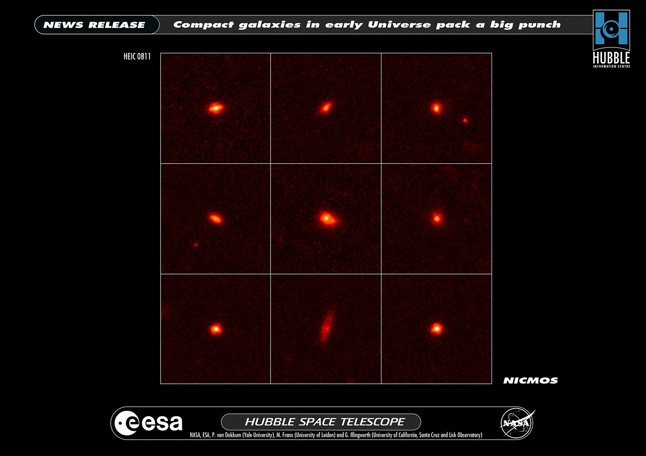 These images taken by the NASA/ESA Hubble Space Telescope show nine compact, ultra-dense galaxies as they appeared 11 billion years ago.