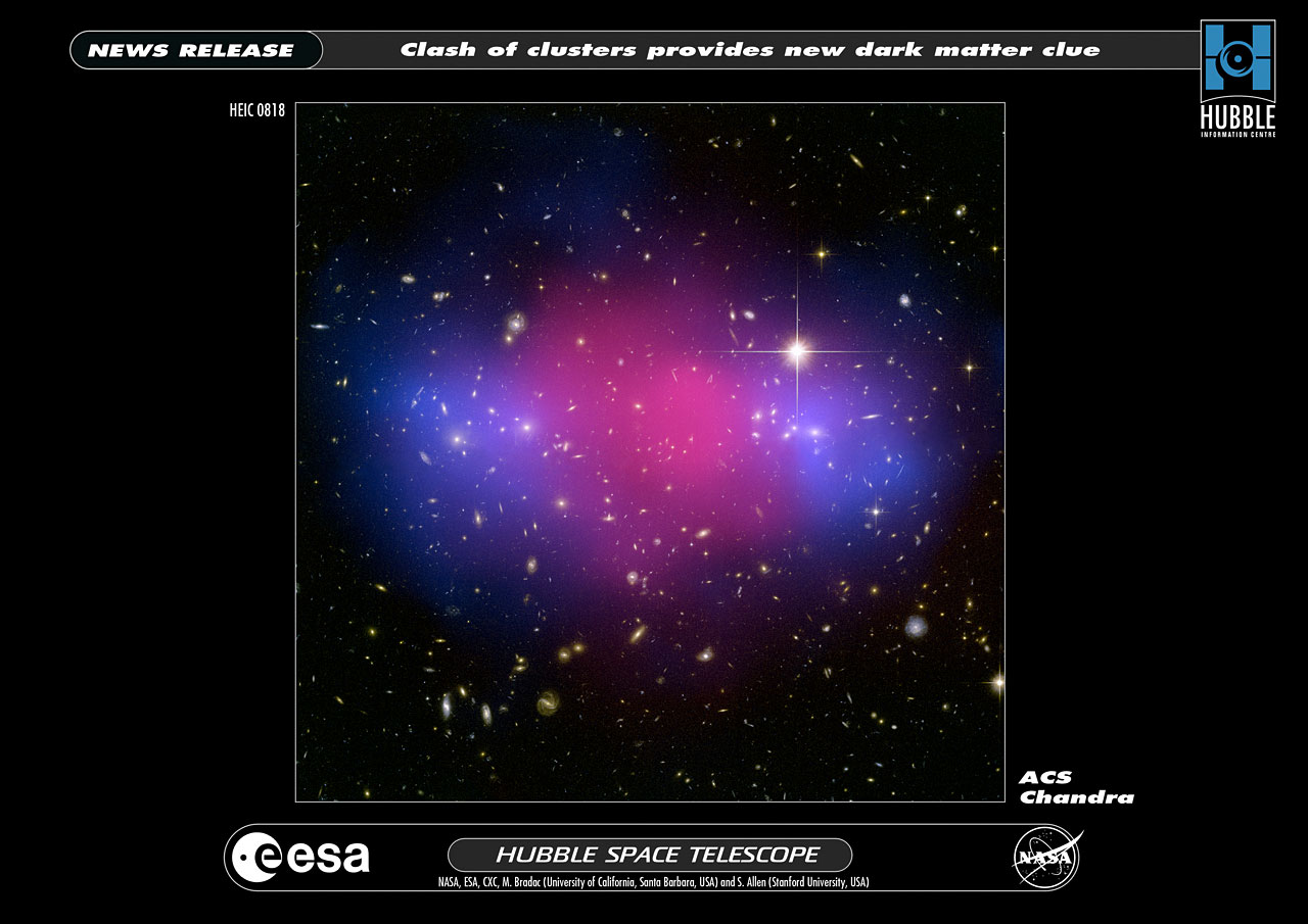 This astounding view of galaxy cluster MACSJ0025 demonstrates how ordinary matter and mysterious dark matter interact. The blue cloud-shaped parts flanking the centre show the position of dark matter, mapped by the Advanced Camera for Surveys onboard the NASA/ESA Hubble Space Telescope. The pink middle indicates ordinary matter, charted by NASA's Chandra X-Ray Observatory.