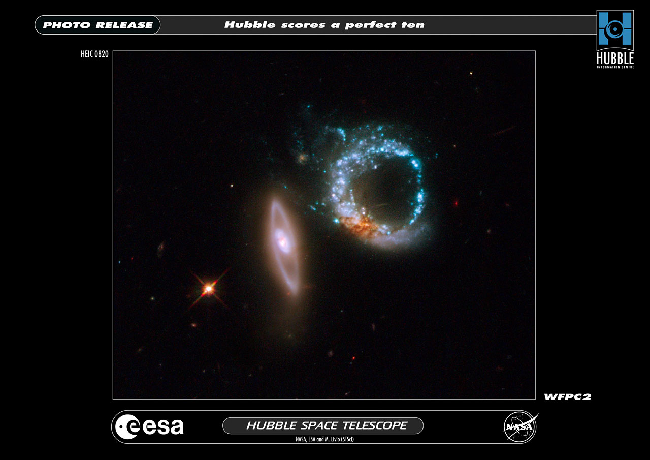 The two galaxies happen to be oriented so that they appear to mark the number 10. The left-most galaxy, or the "one" in this image, is relatively undisturbed, apart from a smooth ring of starlight. It appears nearly edge-on to our line of sight. The right-most galaxy, the "zero" of the pair, exhibits a clumpy, blue ring of intense star formation.