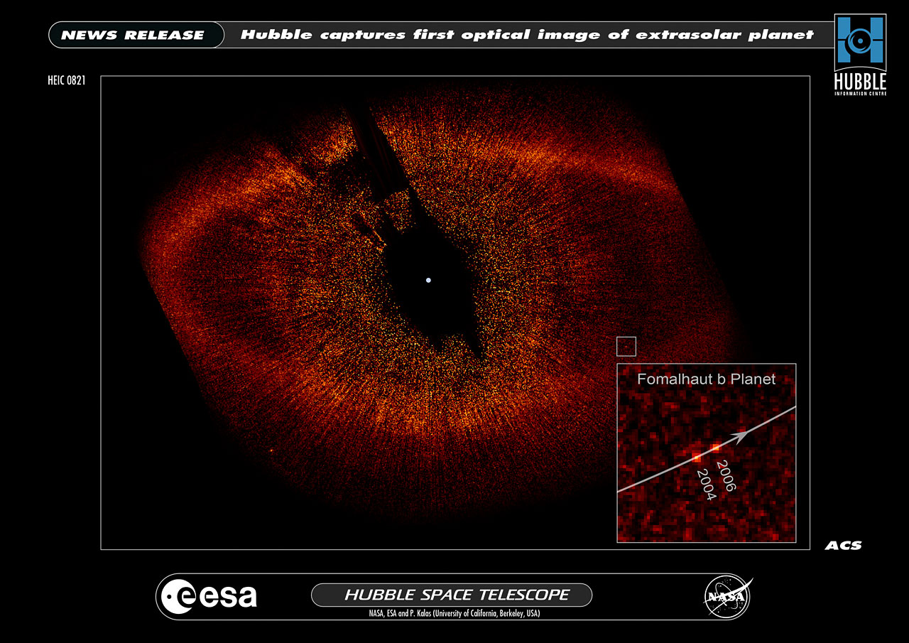 This image, taken with the Advanced Camera for Surveys aboard the NASA/ESA Hubble Space Telescope, shows the newly discovered planet, Fomalhaut b, orbiting its parent star, Fomalhaut.