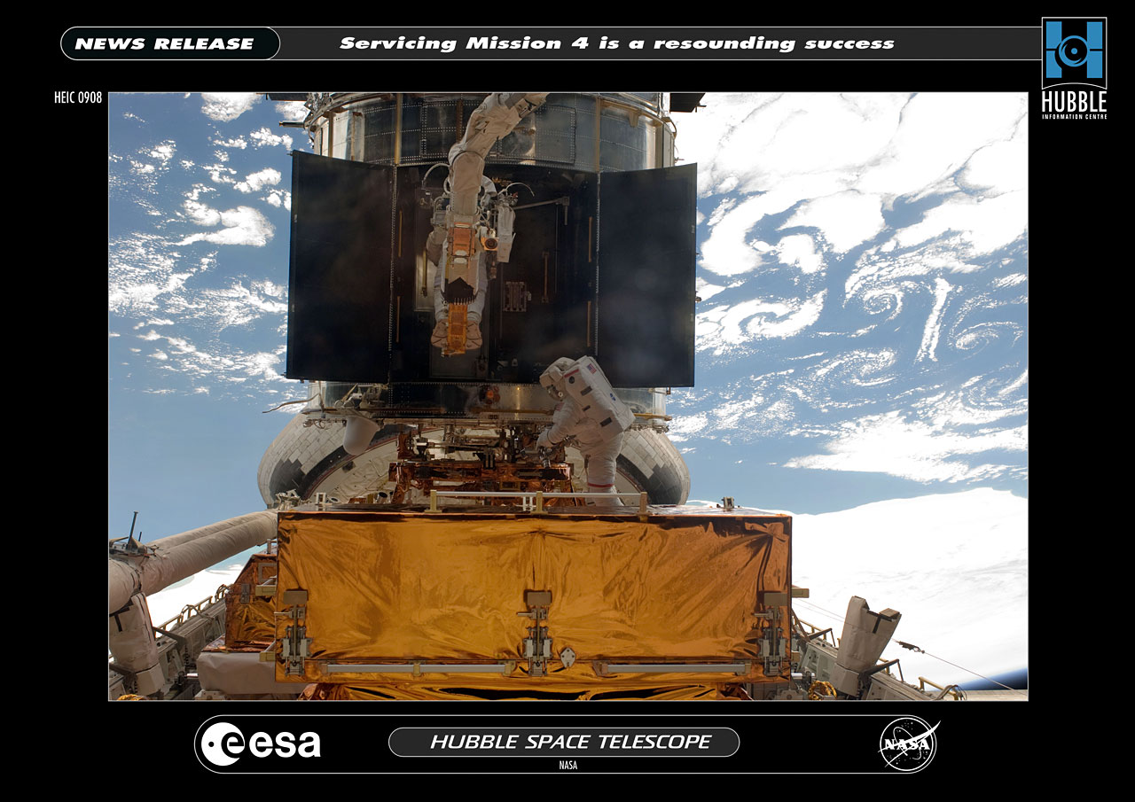 Astronauts Andrew Feustel (partially obscured at top) and John Grunsfeld work to install the new Cosmic Origins Spectrograph (COS) onboard the NASA/ESA Hubble Space Telescope on the third spacewalk of Servicing Mission 4.