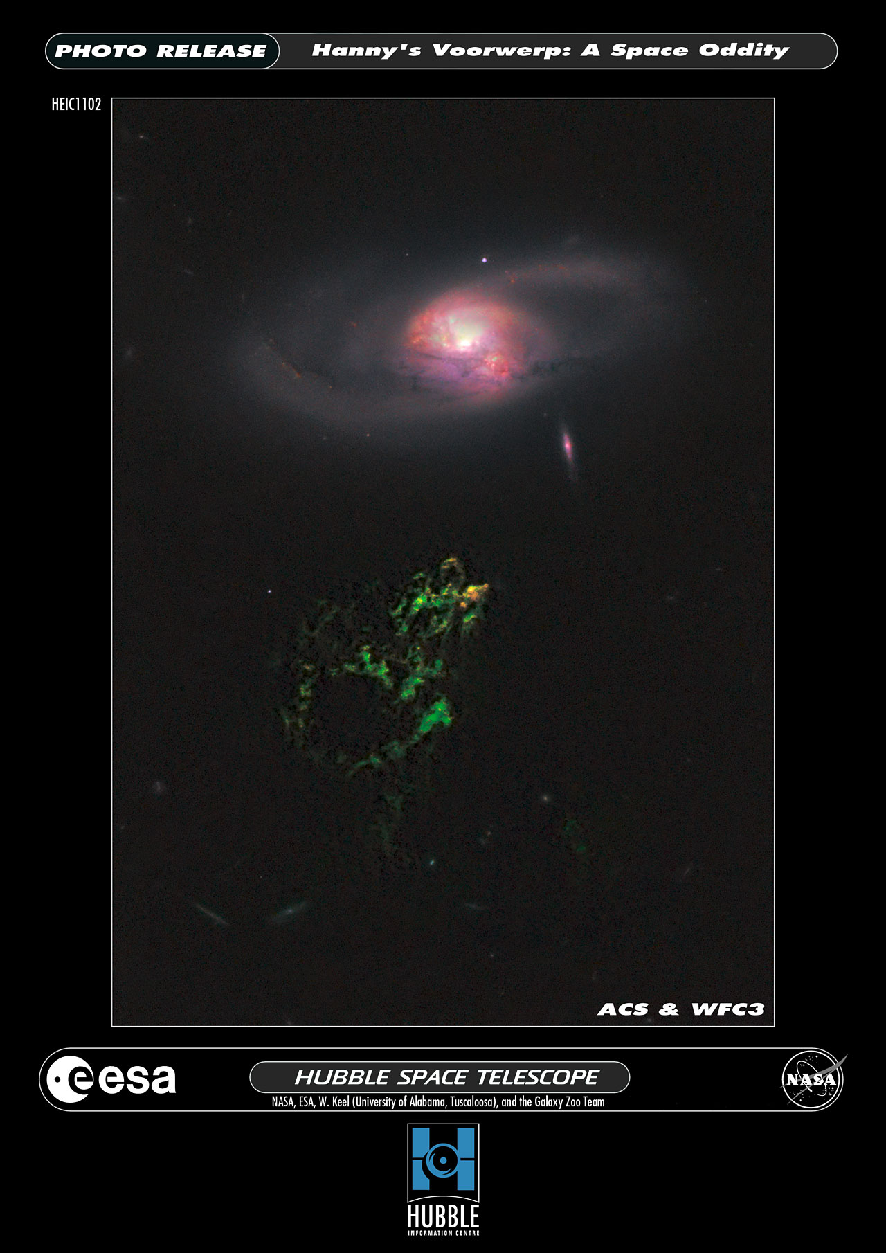 The bizarre object, dubbed Hanny’s Voorwerp (Hanny’s Object in Dutch), is the only visible part of a streamer of gas stretching 300 000 light-years around the galaxy, called IC 2497. The greenish Voorwerp is visible because a searchlight beam of light from the galaxy’s core has illuminated it. This beam came from a quasar, a bright, energetic object that is powered by a black hole. The quasar may have turned off in the last 200 000 years.
