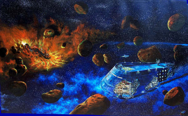 Oil on canvas 50" x 24" 2006 This painting is my version of the Titanic. We have scraped an asteroid, and the predator is lying in wait.