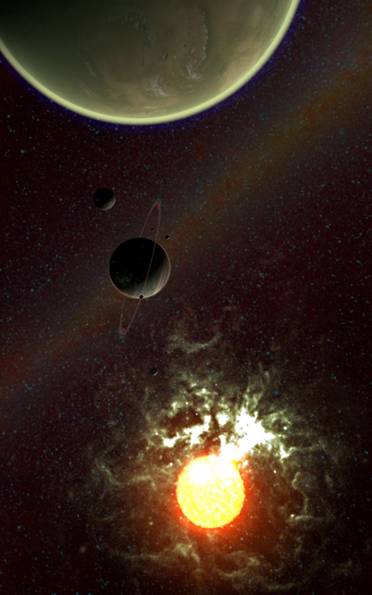 As a star gets older - its tempreture raises and the diameter extends out to enormous size. Now you will call it a red giant. A saturn-like planet with many big moons and far away placed from the star will heat up and allows for some millions of years a ecosystem to evolve. But this could soon have a harsh end!