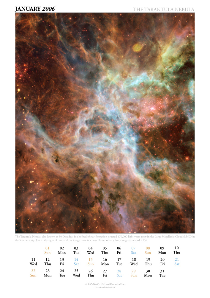 The Tarantula Nebula, also known as 30 Doradus, is a hotbed of star-formation situated 170,000 light-years away in the Large Magellanic Cloud (LMC) in the Southern sky. Just to the right of centre of the image there is a huge cluster of very hot young stars called R136.