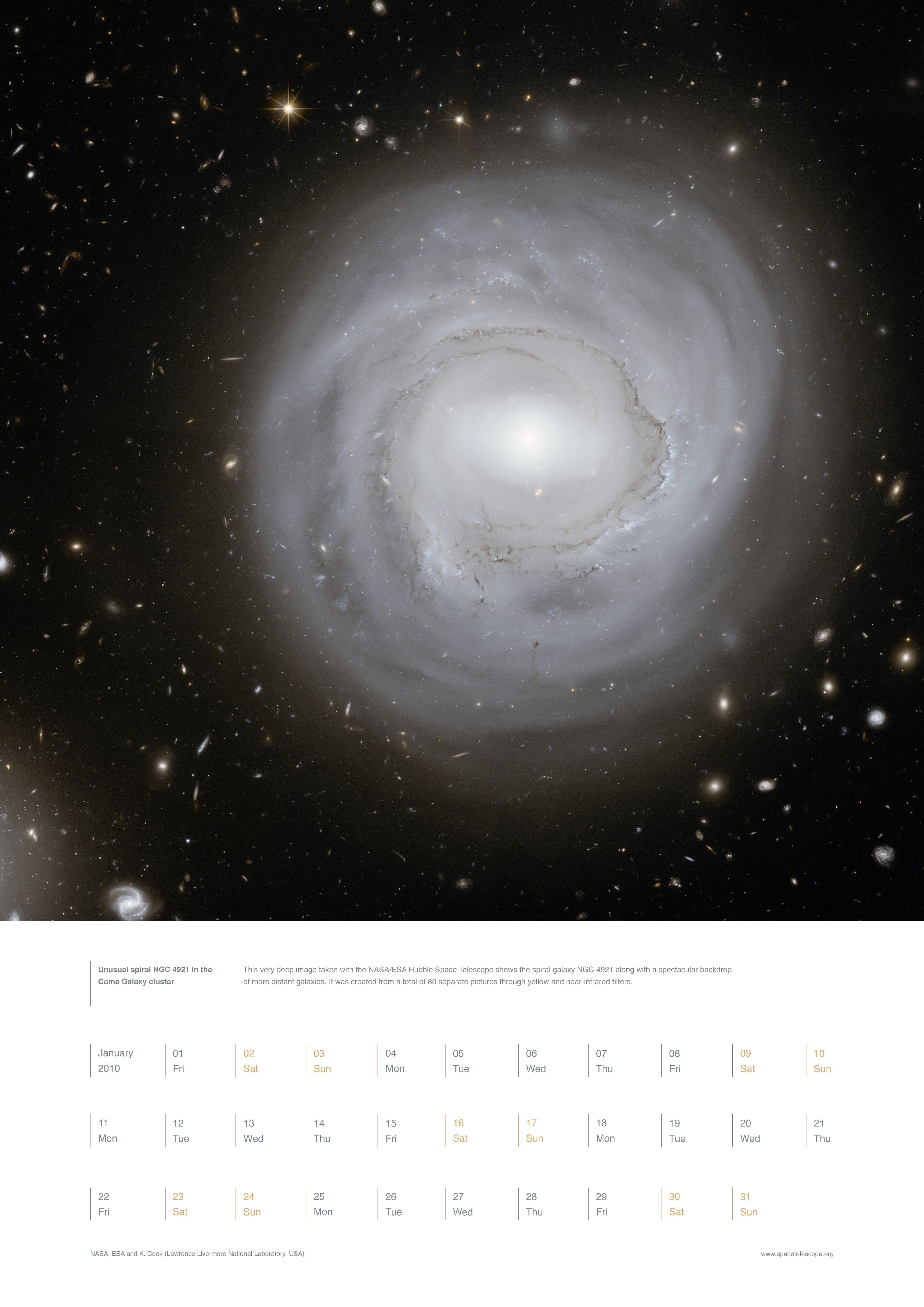 This very deep image taken with the NASA/ESA Hubble Space Telescope shows the spiral galaxy NGC 4921 along with a spectacular backdrop of more distant galaxies. It was created from a total of 80 separate pictures through yellow and near-infrared filters.