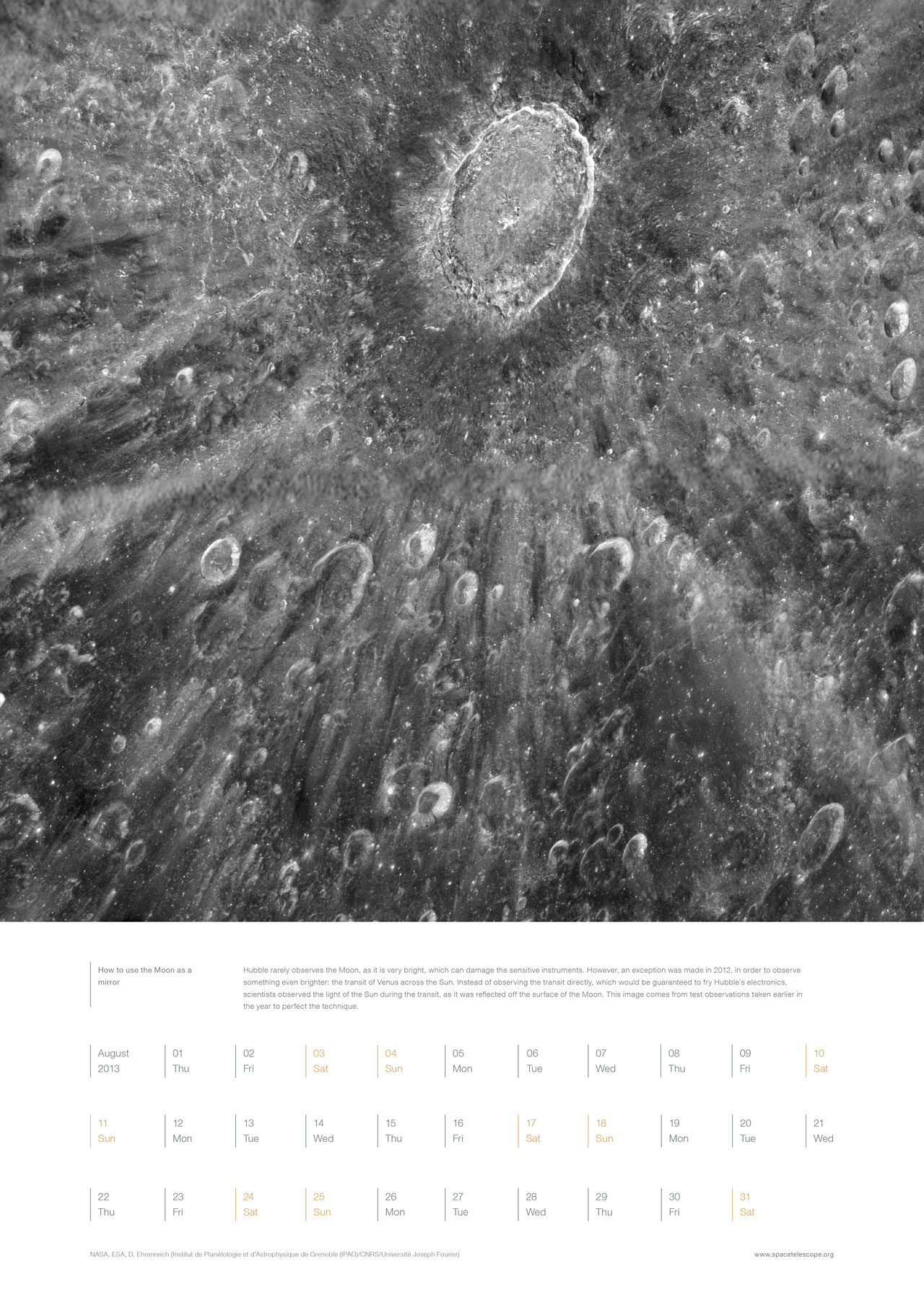 Hubble rarely observes the Moon, as it is very bright, which can damage the sensitive instruments. However, an exception was made in 2012, in order to observe something even brighter: the transit of Venus across the Sun. Instead of observing the transit directly, which would be guaranteed to fry Hubble’s electronics, scientists observed the light of the Sun during the transit, as it was reflected off the surface of the Moon. This image comes from test observations taken earlier in the year to perfect the technique.