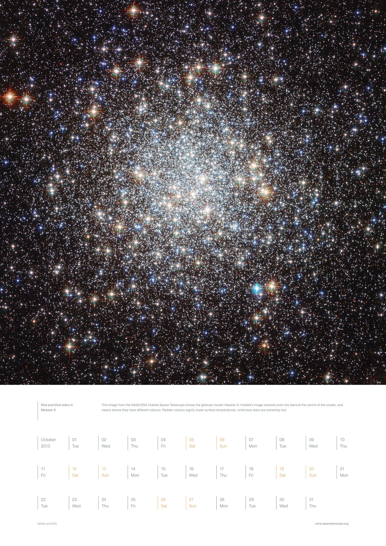 This image from the NASA/ESA Hubble Space Telescope shows the globular cluster Messier 9. Hubble’s image resolves even the stars at the centre of the cluster, and clearly shows they have different colours. Redder colours signify lower surface temperatures, while blue stars are extremely hot.