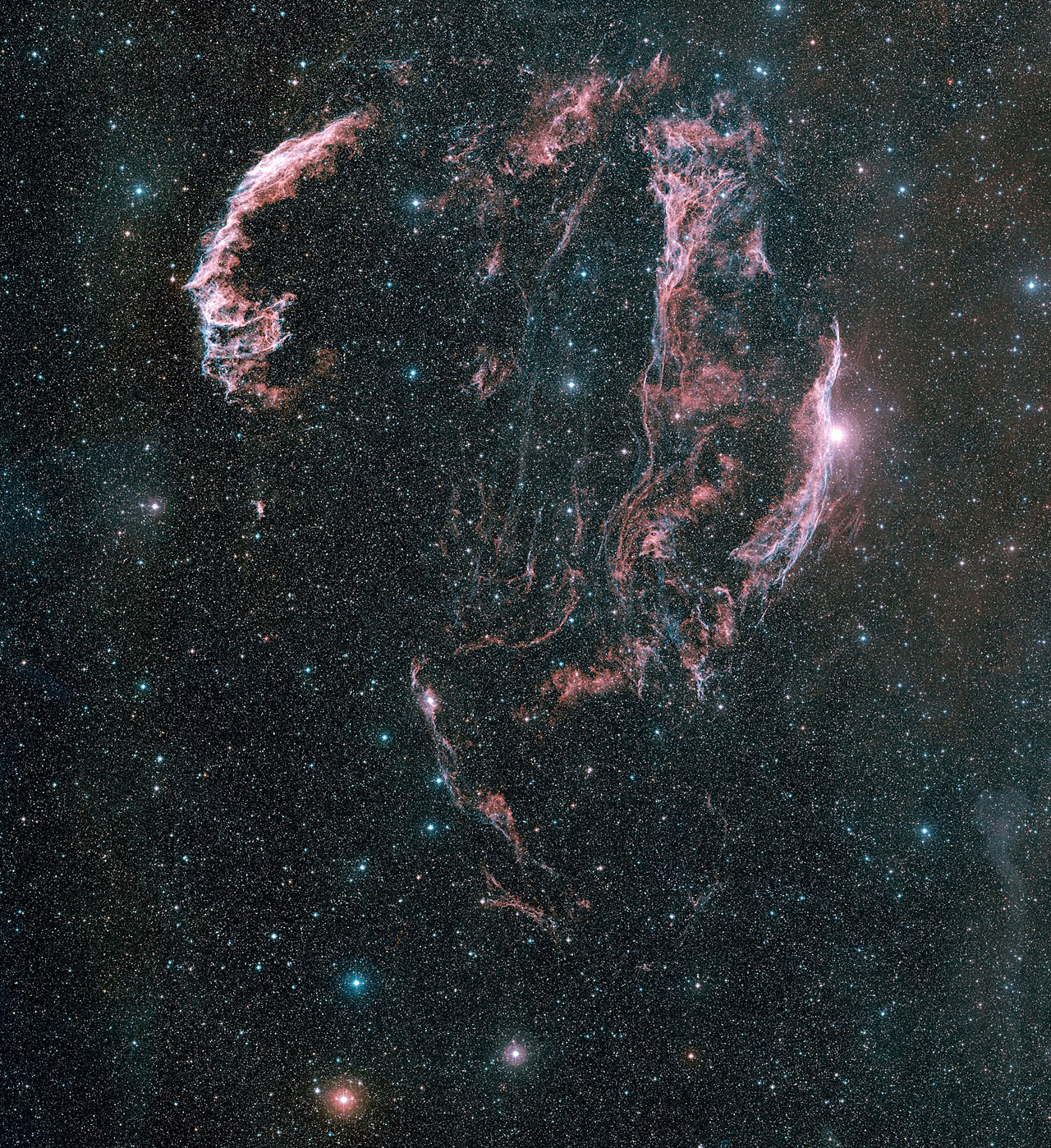 Here is a picture of the Veil Nebula, the supernova remnant in Cygnus. I used images from the DSS2 in two color bands, Red and Blue. The Green band was computer generated. The full size image is 14,936 x 16,312 pixels, resolution of one arcsec per pixel. Here is just a very small preview.