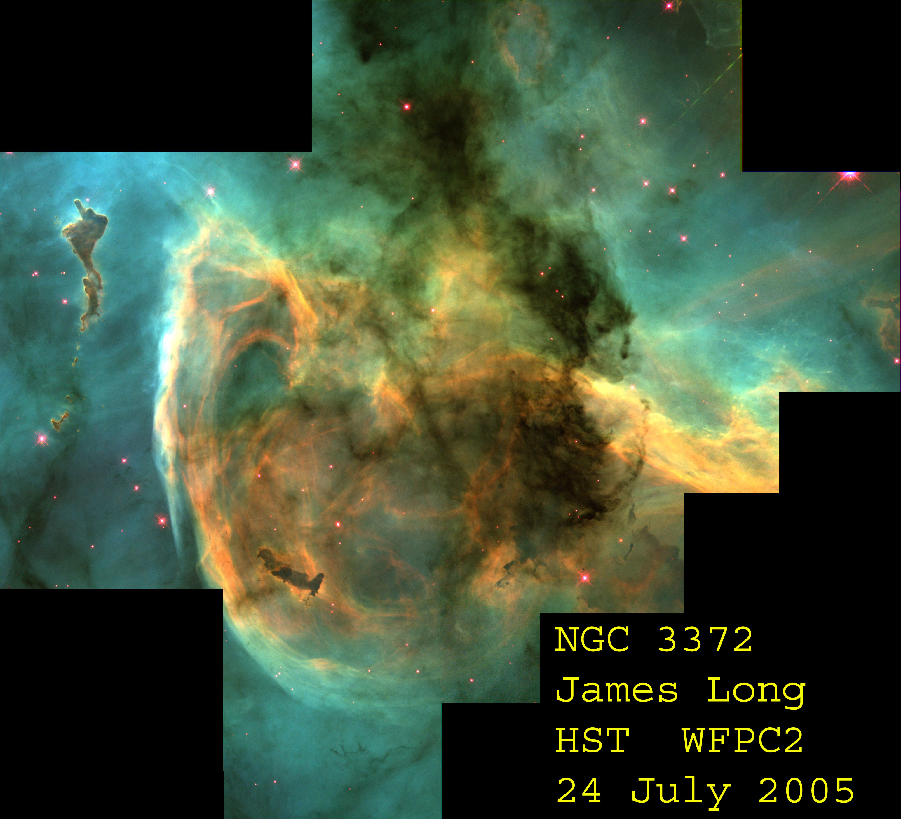 Here is an image of NGC 3372. I used 12 different data sets to make it. Each dataset was mosaicked together using the wmosaic function in the IRAF/STSDAS program. Each of the resulting fits images was opened and manipulated using version 2 of the Fits Liberator and Photoshop CS. I then manually lined up the stars in each of the four images that made up each layer before flattening the image to perform post production touch up. This image has been resized and saved at a lower image quality setting due to size constraints. Many thanks to you and your entire team there for the new Fits Liberator. It is much easier to work with fits images now.