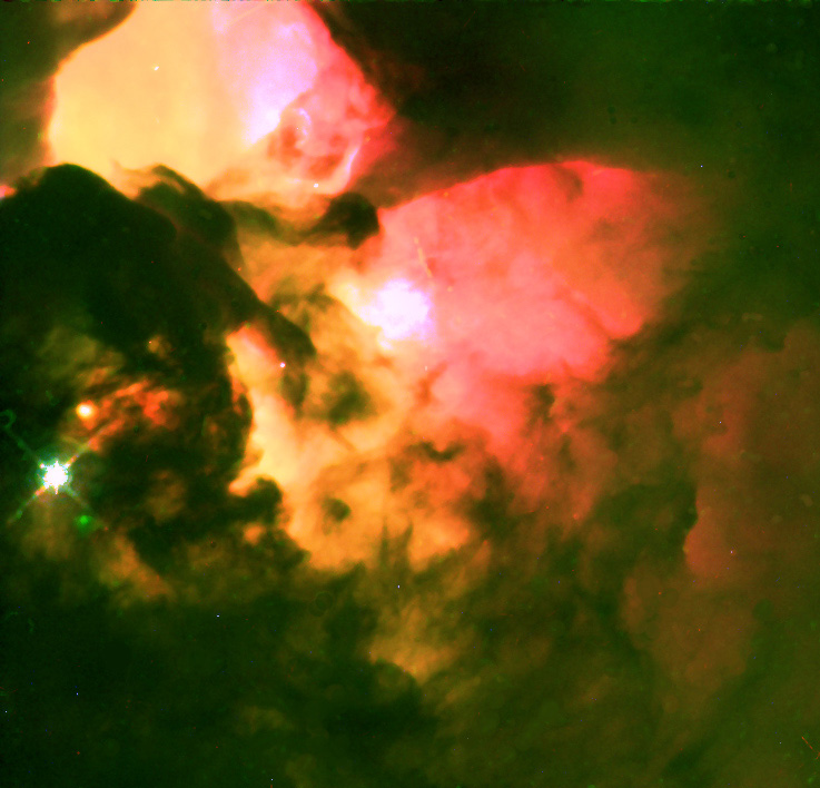 NGC 6523 (M8) Produced with the FITS Liberator and data downloaded from the Hubble WFPC2 ESO archive. Data and Filter sets: * U2O80102B F656 (red), * U2O80104B F547 (green), * U2O80105B F487 (blue). Composed using Linear FITS images with Photoshop Elements 2 (8 bit). The data sets I used above are not very good quality on the fits images using the ******b.C0.fits so I used the *******t.C0.fits on some of the composition. Also had to do some final brushwork to remove a lot of speckles in the background. You can also try the other data sets available,U2O80201B F658N, U2O80203B F814W , U2O80205B F673N, and U2O80208B F953N, but there is a lack of a good green filter with this set (unless you can make one) and you can get a lot of red in the final images.