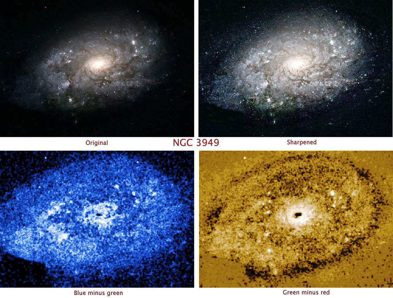 Original images provide a pleasant view but limited scientific data. The 'sharpened' image is processed with a high pass filter and blended with Hard Light to avoid the fringes that unsharp masking produces so readily. The two lower images work in the fourth dimension of the Hertzsprung-Russell diagram and provide spatial images of where the bluer and redder objects reside.
